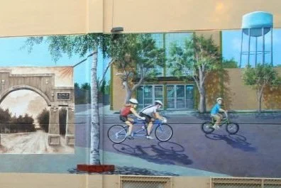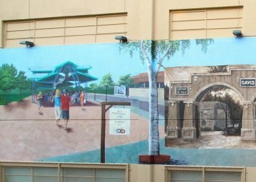 One of the first truly commissioned murals (and the largest at that time) by the Davis Odd Fellows Lodge 169, “Cycle Back in Time” was a collaboration between the Davis Mural Team and David Rosenberg. The vision of the Lodge members was that of a flowing mural about Davis, Davis Life and the Odd Fellows imagery on the side of their building. It was very important to include the images of the famous Davis Arch or the Davis Arch Mural, both of which had been destroyed many years ago. Designing such a large and detailed mural was a challenge, but eventually realized. Starting in the back of the building with the Farmer’s Market, then a banner of the Davis Arch Mural, the street pushes to the front of the building, with a family enjoying the view of the Odd Fellows Lodge and Davis water tower. John Natsoulas brought out the community to cover the 75 foot expanse, with Bill Maul working on the back third of the mural, Myron Stephens polishing up the banner of the arch, and Kerry Rowland-Avrech finished up the trees, street and foreground of the family and building.